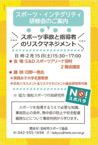 当協会加盟団体指導者の指導力の向上を図り、安定的・継続的な団体運営に資することを目的として、実践女子大学名誉教授で日本ハラスメント&リスクマネジメント総合研究所代表の日野一男先生をお迎えし、S&Dスポーツアリーナ羽村 2 階会議室において、2 月 15 日(土)に「スポーツ事故と指導者のリスクマネジメント」と題した研修会を開催しました。
