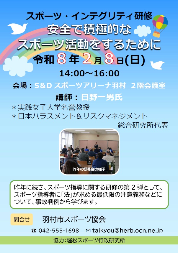 当協会加盟団体指導者の指導力の向上を図り、安定的・継続的な団体運営に資することを目的として、昨年に引き続き、実践女子大学名誉教授で日本ハラスメント&リスクマネジメント総合研究所代表の日野一男先生をお迎えし、S&Dスポーツパーク羽村2階会議室において、令和8年2月8日(日)に「安全で積極的なスポーツ活動をするために」と題した第2弾となる指導者向けの研修会を開催しました。